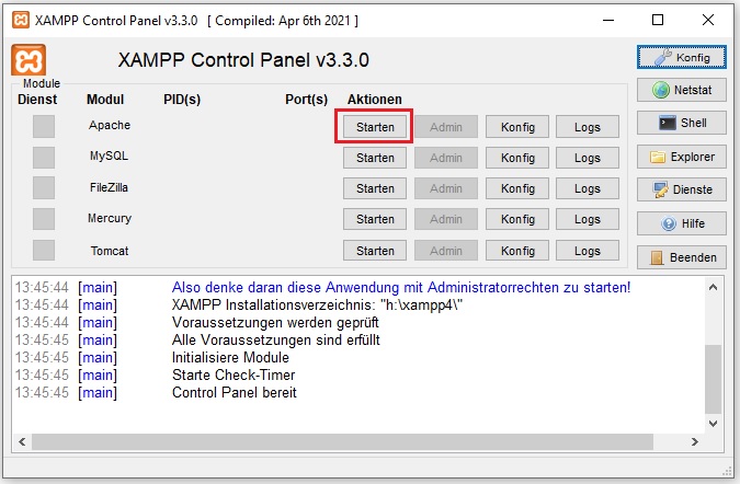 Es öffnet sich das Control-Panel. Starten Sie das Modul Apache (siehe Abbildung 2.2 XAMPP-Panel).