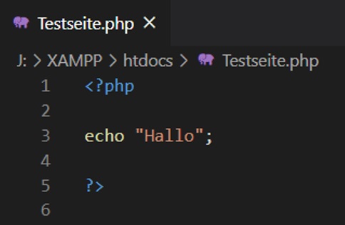 Öffnen Sie einen HTML-Editor Ihrer Wahl (z.B. Visual Studio Code) und legen Sie ein neues File an. Nennen Sie die Datei Testseite. Speichern Sie die Datei als PHP-Datei (.php) in dem Verzeichnis XAMPP/htdocs ab.