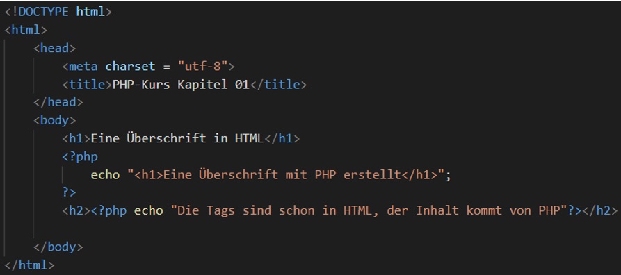 PHP wird in der Regel in Form von kleineren Skripts zwischen oder in die HTML-Elemente eingefügt. Das heißt, grundsätzlich erfolgt weiterhin die Erstellung von HTML-Seiten, die ab jetzt jedoch PHP-Code enthalten und darum vom Datei-Typ .php sind und nicht mehr .html.