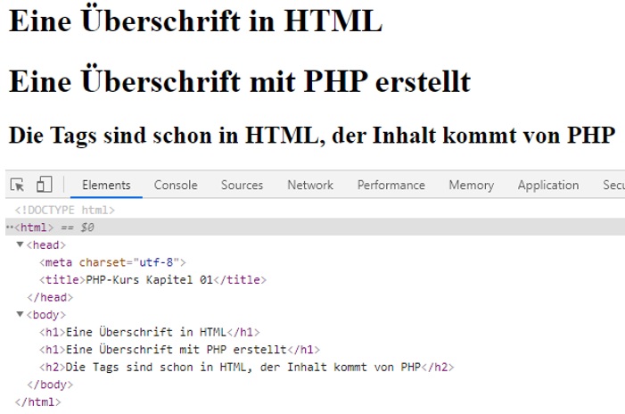 PHP-Code wird auf dem Server ausgeführt. Der Browser, der lokal auf dem Rechner arbeitet, sieht nichts von den PHP-Befehlen. Dieser erhält nur das Resultat vom Server. Das heißt, der Apache-Server führt die PHP-Befehle aus und schickt das Ergebnis an den Browser. Der Browser bekommt eine Datei in der nur HTML-Tags zu finden sind.