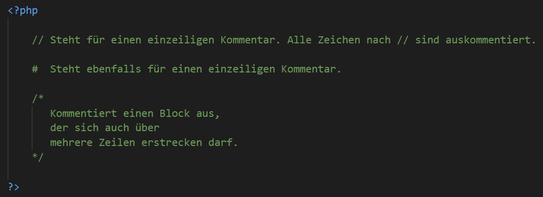 Ein Kommentar ist Text im Quellcode, der vom PHP-Interpreter nicht ausgeführt wird. Kommentare dienen in der Praxis dazu, Teile des Codes vernünftig zu erklären oder sonstige Informationen mitzuliefern. PHP verwendet eine Syntax für Kommentare, die Sie vielleicht schon aus JavaScript oder anderen Sprachen kennen: