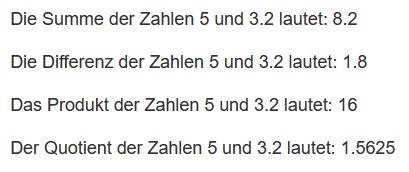 Führen Sie nun mit den zwei Zahlen die vier Grundrechenarten durch und speichern Sie die Ergebnisse in die jeweilige Variable.