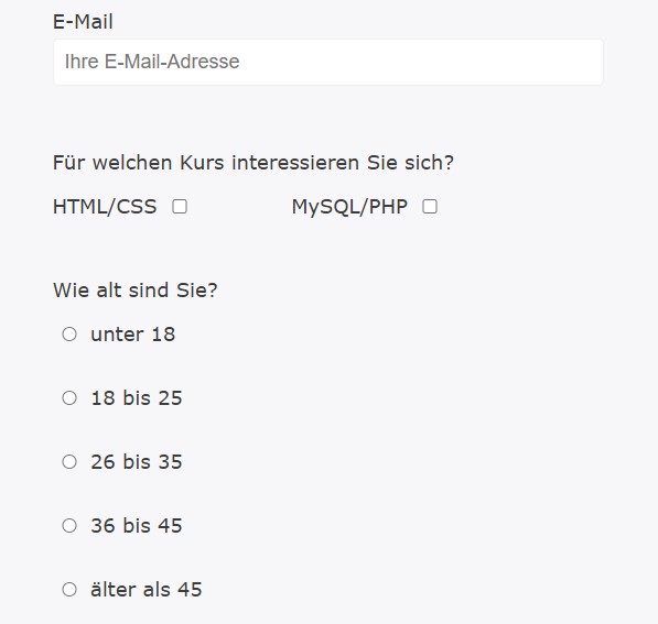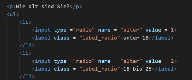 Wir bleiben bei unserem Formular und ergänzen es um Radiobuttons. Das sind input-Tags vom Typ radio. Es soll das Alter abgefragt werden. Hierfür gibt es 5 Altersbereiche.