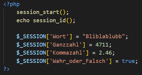 Sobald eine Session gestartet wurde, können Webentwickler Daten in den Session-Speicher schreiben. Die Variable $_SESSION ist ein Array, in das beliebige Daten geschrieben werden können, einschließlich Strings, Zahlen, Arrays und Objekten (vergleichbar mit der Variablen $_POST).