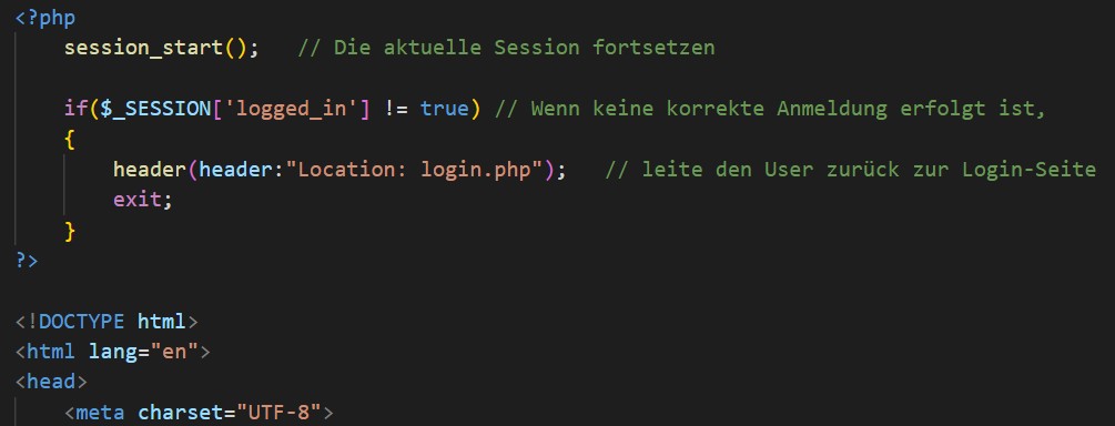 Als erstes müssen wir mit der Funktion session_start() auf die aktuelle Session zugreifen (falls diese zuvor gestartet wurde). Hat sich der Benutzer nicht korrekt angemeldet, wurde das Feld 'logged_in' nicht auf true gesetzt. Es folgt die erzwungene Weiterleitung zurück zur Login-Seite.
