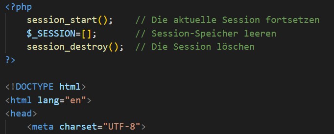 Wir wechseln nun zur Datei logout.php und ergänzen hier ganz oben in der Datei folgenden Code (siehe untere Abbildung).